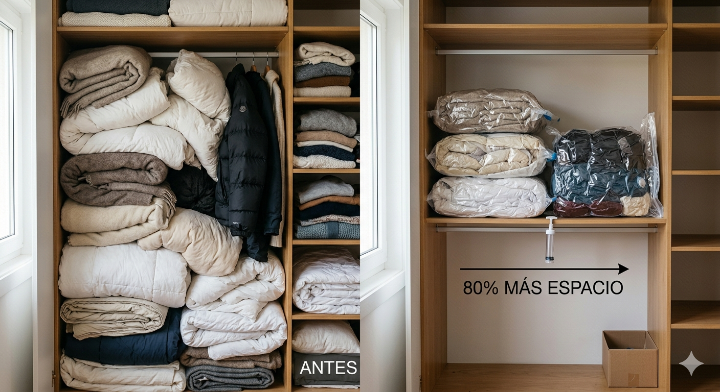 del espacio de tu armarioMantas, edredones, ropa de temporada... todo comprimido al mínimo. Tu armario nunca estuvo tan ordenado.