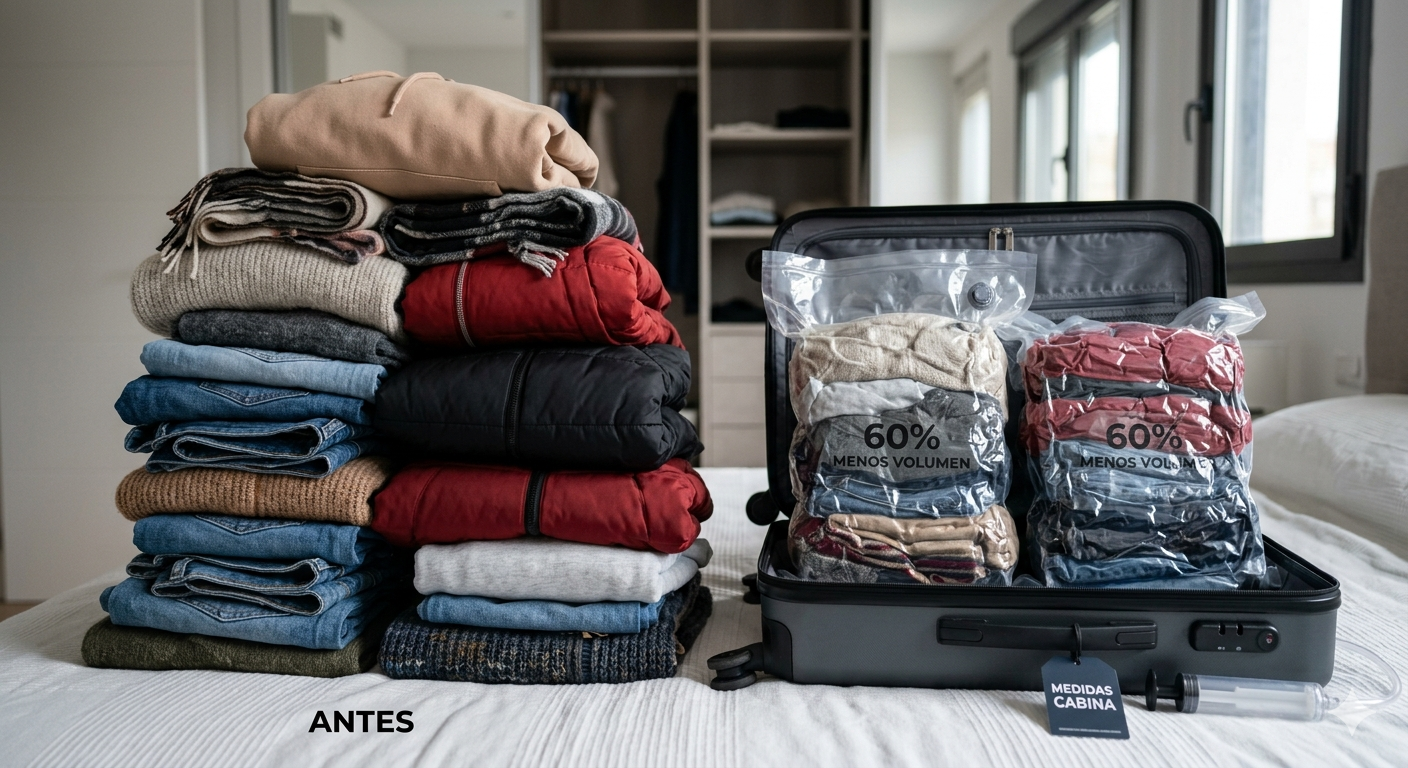 de ropa en tu maletaComprime jerseys, pantalones y abrigos hasta un 60%. Perfectas para maleta de cabina y viajes largos.